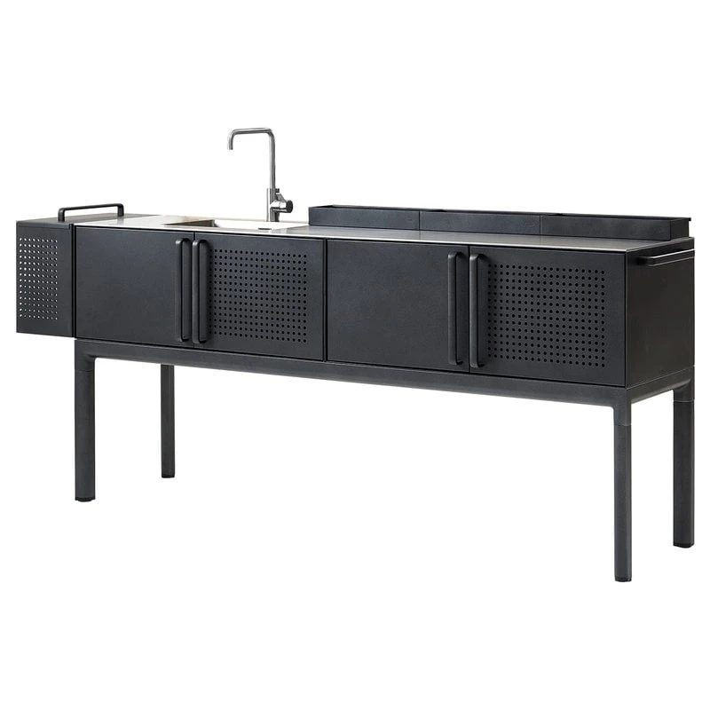Cane-linen Drop-keittiömoduuli sisältää kaikki oleellisimmat kesäkeittiön astiakaapin varustelut. Alumiinista valmistettuun moduuliin kuuluu hanan, altaan ja teräksisen allastason lisäksi säilytystilaa astioille tai grillaustarvikkeille sekä moduulin sivuun kiinnitetty kätevä roskasäiliö. Voit halutessasi täydentää keittiömoduulia esimerkiksi Drop-sarjan baaritasolla.