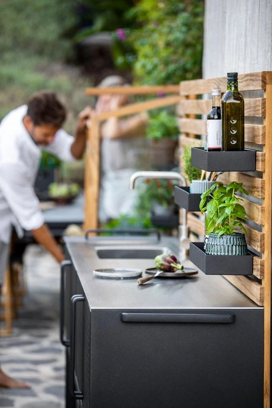 Cane-linen modulaarisen Drop-kokoelman avulla luot tyylikkään ja modernin kesäkeittiön kesämökille tai puutarhaan. Kokoelman metallista valmistetut moduulit sopivat erityisesti skandinaaviseen ja pelkistettyyn tyyliin, mutta tiikkisten lisäosien avulla niiden ilmettä on helppo muokata luonnollisemmaksi ja lämpimämmäksi. Drop-kokoelmalla Cane-line kannustaa nauttimaan ulkoilmasta täysin siemauksin myös ruokaa laittaessa!