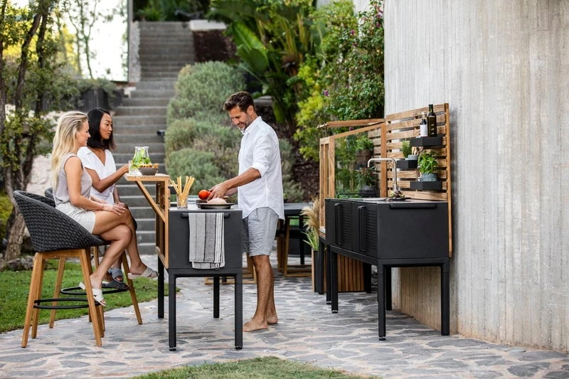 Cane-linen modulaarisen Drop-kokoelman avulla luot tyylikkään ja modernin kesäkeittiön kesämökille tai puutarhaan. Kokoelman metallista valmistetut moduulit sopivat erityisesti skandinaaviseen ja pelkistettyyn tyyliin, mutta tiikkisten lisäosien avulla niiden ilmettä on helppo muokata luonnollisemmaksi ja lämpimämmäksi. Drop-kokoelmalla Cane-line kannustaa nauttimaan ulkoilmasta täysin siemauksin myös ruokaa laittaessa!