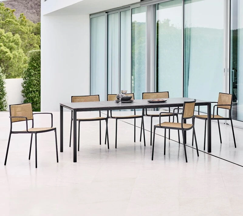 Cane-linen käsinojallinen Less-tuoli tuo parvekkeelle, terassille tai puutarhaan eleganttia nykydesignia Tanskasta. Designduo Welling/Ludvikin muotoilema Less-terassituoli muodostuu selkeälinjaisesta alumiinirungosta sekä punotusta polyrottinki-istuimesta, jonka lävitse siivilöityvä auringonvalo antaa tuolille ilmavan luonteen. Venetsialaistuolien tyyliä muistuttava polyrottinkipunos tekee Less-tuolista paitsi kauniin, myös helppohoitoisen ja kestävän: UV-suojattu ja haalistumaton materiaali on suunniteltu kestämään kaikenlaisia sääolosuhteita eikä se säikähdä pienestä kesäsateesta tai edes raekuurosta. Käsinojalliset tuolit pinoutuvat päällekkäin, joten ne voi varastoida pienessäkin tilassa valmiina terassikauden avausta varten.