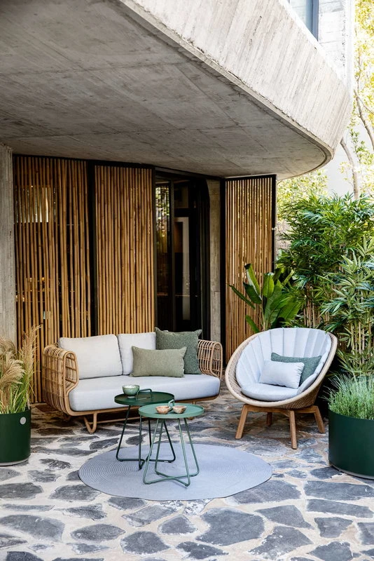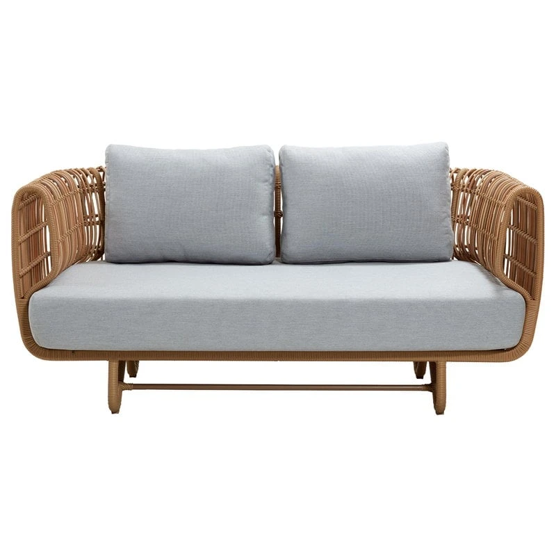 Cane-linen Nest-sohva edustaa tanskalaista ulkokalustemuotoilua kauneimmillaan. Foersom & Hiort-Lorenzenin suunnittelema, kahden istuttava Nest-sohva on valmistettu alumiinista ja Cane-line Weave -materiaalista, ja pehmustettu ulkokäyttöön erityisesti suunnitelluilla sohvatyynyillä. Cane-line Weave on polyeteenistä valmistettu muovikuitu, joka sopii erinomaisesti ulkokalusteisiin, sillä se säilyttää värinsä ja muotonsa vuodesta toiseen vaihtelevissakin sääolosuhteissa. Kokoa kaunis sohvaryhmä terassille tai puutarhaan yhdistämällä Nest-polyrottinkisohva Nest-nojatuoleihin.