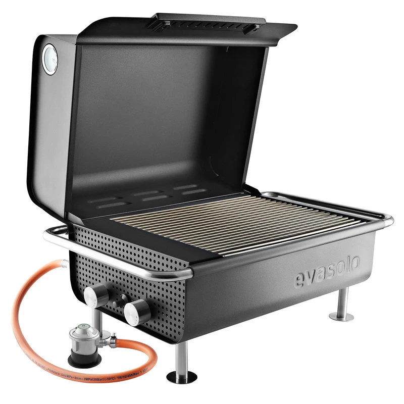 Eva Solon Box-kaasugrilli on tehokas ja kompaktin kokoinen terassigrilli, jota voi käyttää joko pöytägrillinä tai seisovana mallina erikseen myytävien jalkojen kanssa. Tyylikkään mattamustaksi maalatusta teräksestä valmistettu kaasugrilli on täydellinen valinta parvekkeille ja pienillekin terasseille, ja tilavan grillausalustan ansiosta siinä pystyy kypsentämään suuriakin pihvejä ja vartaita. Sekä suoraan että epäsuoraan grillaukseen sopiva terassigrilli on varustettu kahdella polttimella, tilavalla kannella ja sivuista löytyvillä kantokahvoilla. Viimeistele kokonaisuus erikseen myytävien jalkojen ja sivupöydän avulla.