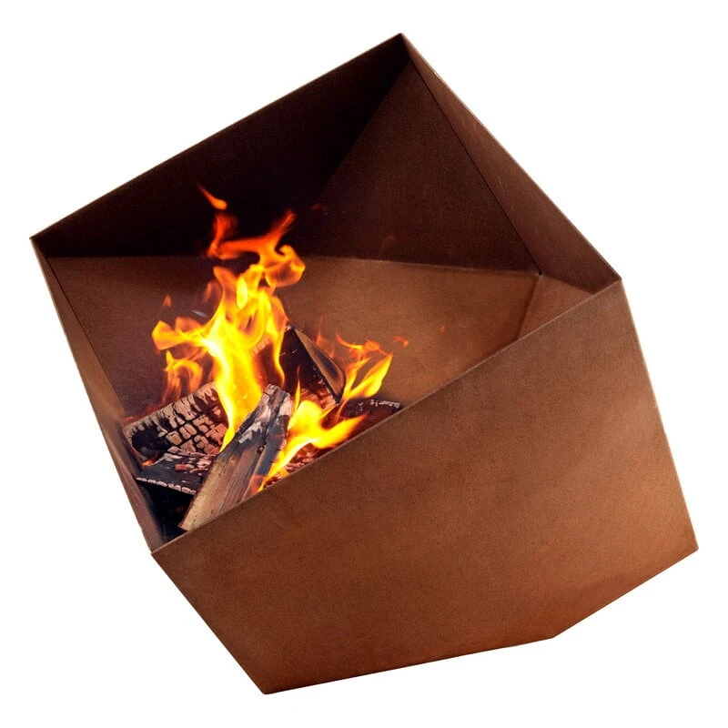 Eva Solon FireCube-ulkotakan yksinkertaisen kaunis muotoilu kätkee taakseen nerokkaita, funktionaalisia yksityiskohtia: kyljellään kenottava tulisija pysyy suojassa tuulenpuuskilta, mutta takan voi myös nostaa pystyasentoon vaikkapa grillailua varten. Upeasti patinoituva ulkotakka on valmistettu säänkestävästä teräksestä – tai Corten-teräksestä – jonka pinta hapettuu hurmaavasti ja alleviivaa tulipadan persoonallista ilmettä.