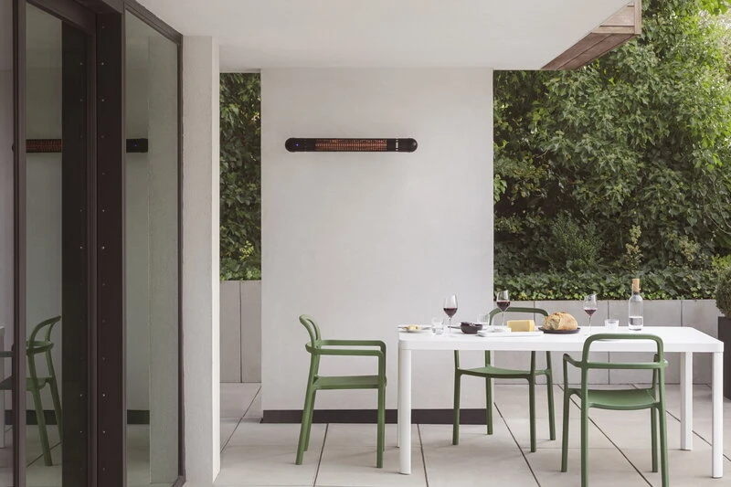 Eva Solon HeatUp-infrapunalämmitin tuo lämpöä viilentyviin iltoihin terassilla. Infrapunatekniikan ansiosta HeatUp lämmittää tehokkaammin ja turvallisemmin kuin perinteiset kaasulämmittimet – infrapunalämpö ei katoa ilmaan, vaan kohdistuu suoraan lämmittimen ympärillä istuviin ihmisiin.