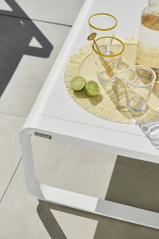 Fermobin Bellevie-sohvapöytä kutsuu kokoamaan läheiset terassille tai puutarhaan, jotta voit nauttia kesän parhaista hetkistä yhdessä perheen tai ystävien kanssa. Sohvapöydän ilmettä hallitsee modernin geometrinen, mutta reunoistaan kauniisti pyöristetty muoto, jonka ansiosta pöytä on helppo yhdistää monenlaiseen sohvaryhmään. Matala puutarhapöytä on valmistettu kevyestä mutta kestävästä alumiinista, joten se kestää hyvin vaihteleviakin sääolosuhteita.