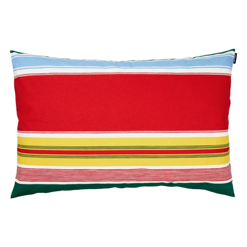 Marimekon ulkotyynyn päällistä koristaa Fujiwo Ishimoton suunnittelema, raidallinen Paraati-kuvio. Raidat ovat jo vuosikymmeniä olleet erottamaton osa Marimekon monipuolista kuviomaailmaa – monivärinen Paraati on Ishimoton raikas tulkinta niistä.