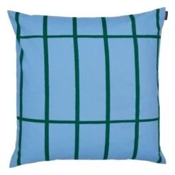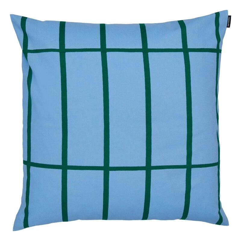 Marimekon Tiiliskivi-ulkotyynyn päällistä rytmittää pelkistetyn geometrinen, sini-vihreä ruudukkokuosi vuodelta 1952. Tiesitkö, että klassikkokuvion on suunnitellut itse Marimekon perustaja, Armi Ratia?