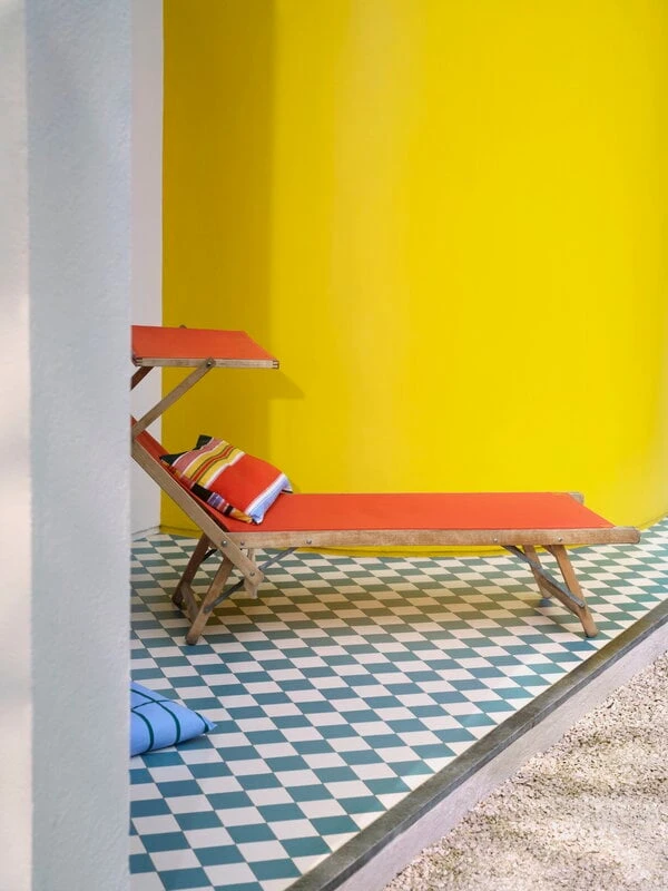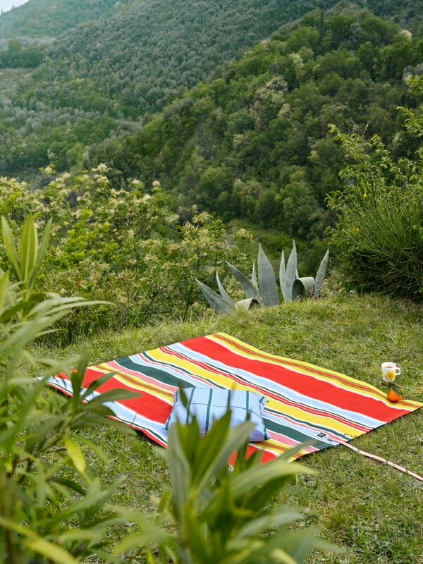Ulkokäyttöön suunniteltu Tiiliskivi-tyynynpäällinen tuo ajatonta Marimekko-designia parvekkeelle tai terassille. Päällinen on valmistettu kierrätetystä polyesterista, ja siinä on vettähylkivä pinta yllättävien sadekuurojen varalta. Pinnassa on myös UV-säteiltä suojaava käsittely, jonka ansiosta värit eivät haalistu keskikesän auringossa. Huomaathan, että Marimekon tyynynpäälliset ommellaan koko kankaan leveydestä, ja niinpä niiden kuvion ja värien asettelu saattaa vaihdella.
