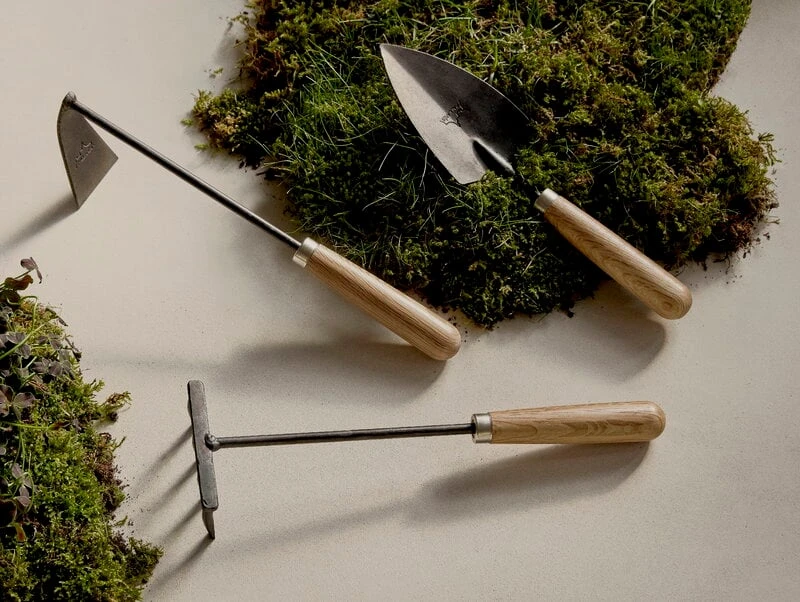 Pallarès x Menu -yhteistyökokoelman puutarhatyökaluista löytyy oikea väline jokaiseen puutarhan puuhaan. Kolmeosainen setti sisältää kuokan, haravan ja istutuslapion, jotka on luotu monipuoliseen mullassa möyrimiseen: niin kaivaminen, rikkaruohojen kitkeminen kuin istuttaminenkin onnistuvat näppärästi ja nopeasti näiden työkalujen avulla. Puutarhatyökalut on valmistettu laadukkaasta, aikaa ja käyttöä kestävästä hiiliteräksestä, ja niiden tyylikäs ilme on viimeistelty tammikahvalla, josta saa varmasti tukevan otteen.