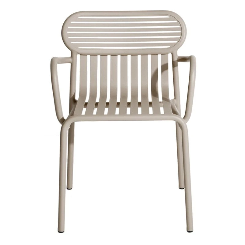 Week-end-tuoli on osa ranskalaisen Petite Frituren alumiinisten ulkokalusteiden kokoelmaa. Viehättävien Weekend-tuolien tunnistettavimpiin piirteisiin kuuluvat niiden selkänojien ovaalinmuotoiset yksityiskohdat sekä vaaka- ja pystysuorien linjojen vuorottelu. Kaikki kokoelman tuolit ovat pinottavia. Linjakkaasti muotoiltu, erityisesti ulkokäyttöön suunniteltu käsinojallinen tuoli sopii sulavasti yhteen saman sarjan pöytien kanssa.