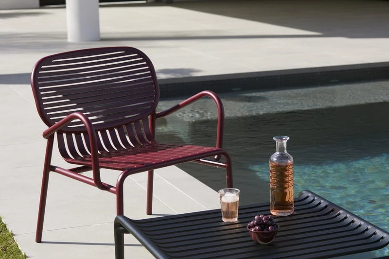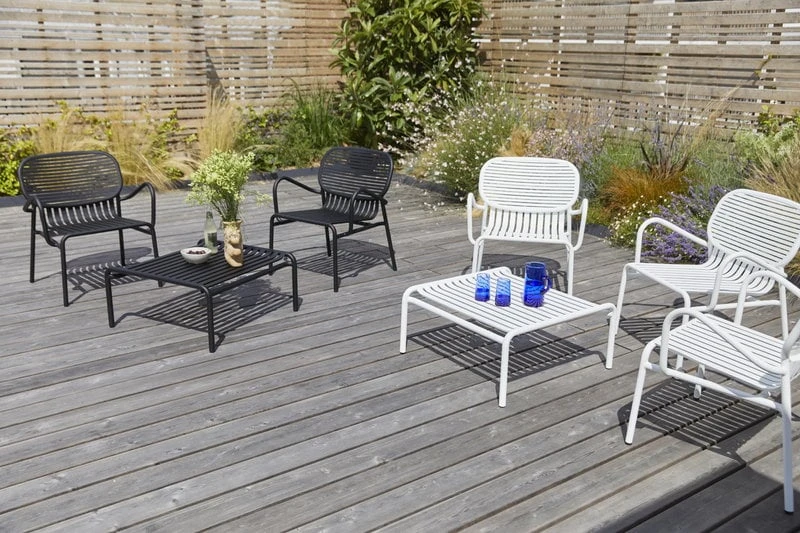 Muotoilijaduo BrichetZieglerin Petite Friturelle suunnitteleman Week-end-kokoelman puutarhakalusteet yhdistelevät erilaisia geometrisia muotoja käytännölliseen nykydesigniin. Alumiinista valmistetut kalusteet ovat rakenteeltaan sekä kevyitä että kestäviä, eikä niiden epoksimaalattu mattapinta säikähdä paahtavaa aurinkoa tai rankkasadetta. Monipuoliseen Week-end-sarjaan kuuluu monen kokoisia ja värisiä pöytiä, tuoleja ja penkkejä sekä suuriin puutarhoihin että pienille parvekkeille. Siron ulkomuotonsa ansiosta kalusteet sopivat myös sisätiloihin.