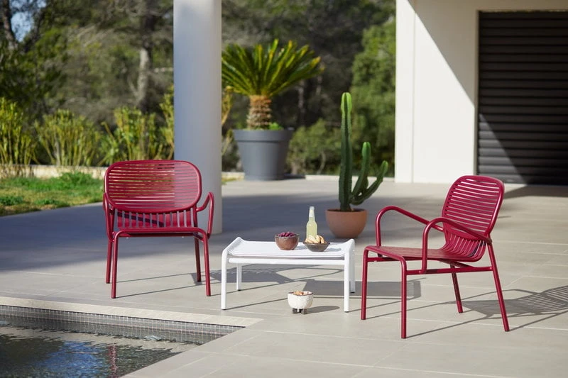 Muotoilijaduo BrichetZieglerin Petite Friturelle suunnitteleman Week-end-kokoelman puutarhakalusteet yhdistelevät erilaisia geometrisia muotoja käytännölliseen nykydesigniin. Alumiinista valmistetut kalusteet ovat rakenteeltaan sekä kevyitä että kestäviä, eikä niiden epoksimaalattu mattapinta säikähdä paahtavaa aurinkoa tai rankkasadetta. Monipuoliseen Week-end-sarjaan kuuluu monen kokoisia ja värisiä pöytiä, tuoleja ja penkkejä sekä suuriin puutarhoihin että pienille parvekkeille. Siron ulkomuotonsa ansiosta kalusteet sopivat myös sisätiloihin.