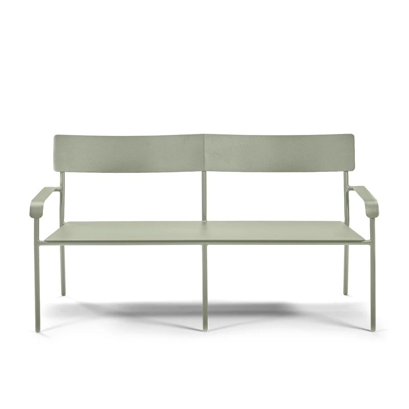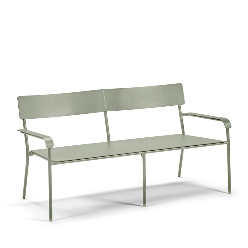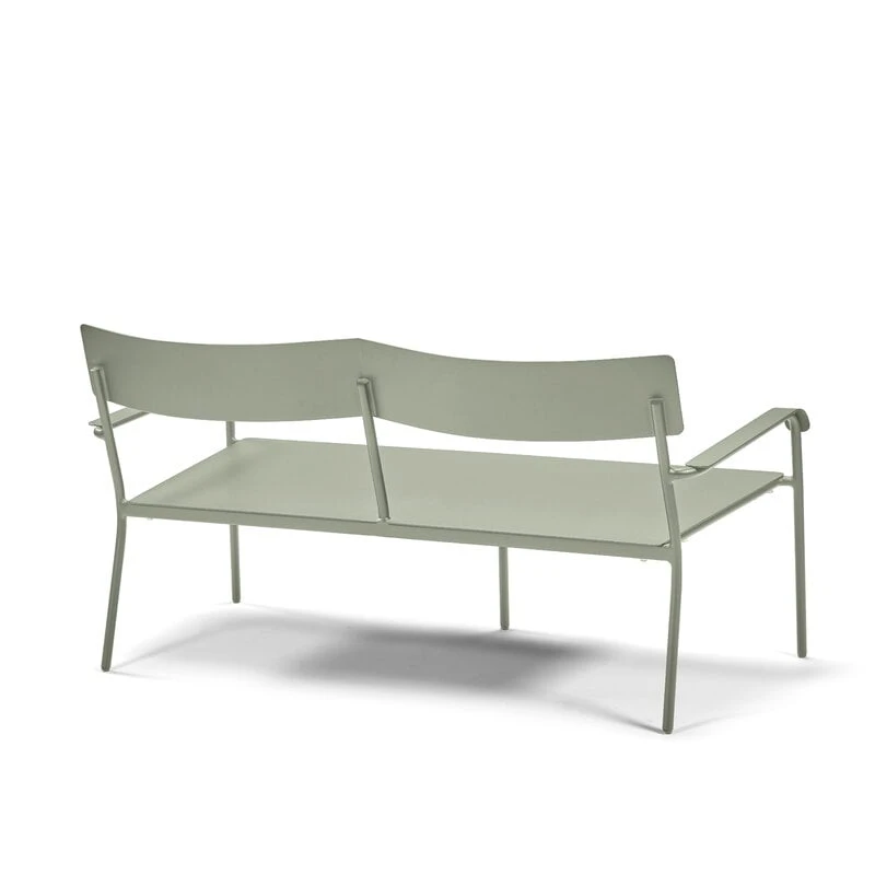 Seraxin kahden istuttava August-penkki on valmistettu jauhemaalatusta alumiinista, ja se sopii sekä sisä- että ulkokäyttöön. Tukevilla selkä- ja käsinojilla viimeistelty metallinen penkki soveltuu yhtä hyvin niin puutarhapenkiksi ulkona kuin ruokapöydän ääreen sisätiloissa.