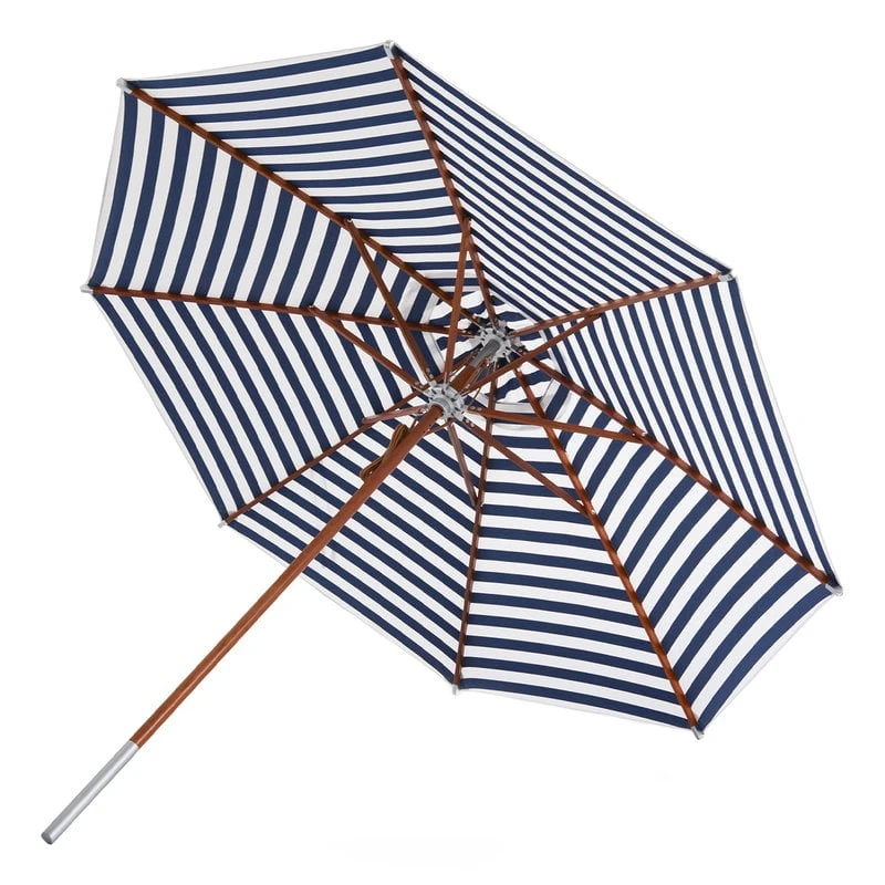 Skagerakin Atlantis-aurinkovarjo täydentää kesäkeitaan ilmeen klassisen tyylikkäällä tavalla. Atlantis-aurinkovarjon runko on lujaa, indonesialaista merantipuuta, ja rungon alaosan metallipäällyste suojaa puuta naarmuilta ja kulumiselta. Teflonpinnoitettu kangas hylkii vettä ja likaa, ja sen kestävyyttä on vahvistettu entisestään nahkaosioilla. Puupinnan ja raidallisen kankaan yhdistelmä antaa aurinkovarjolle ajattoman, luonnonläheisen ilmeen.