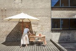 Skagerakin Messina-aurinkovarjo täydentää kesäkeitaan ilmeen klassisen tyylikkäällä tavalla. Messina-aurinkovarjon runko on lujaa, indonesialaista merantipuuta, ja sen teflonpinnoitettu kangas hylkii vettä ja likaa. Puupinnan ja vaalean kankaan yhdistelmä antaa aurinkovarjolle ajattoman, luonnonläheisen ilmeen.